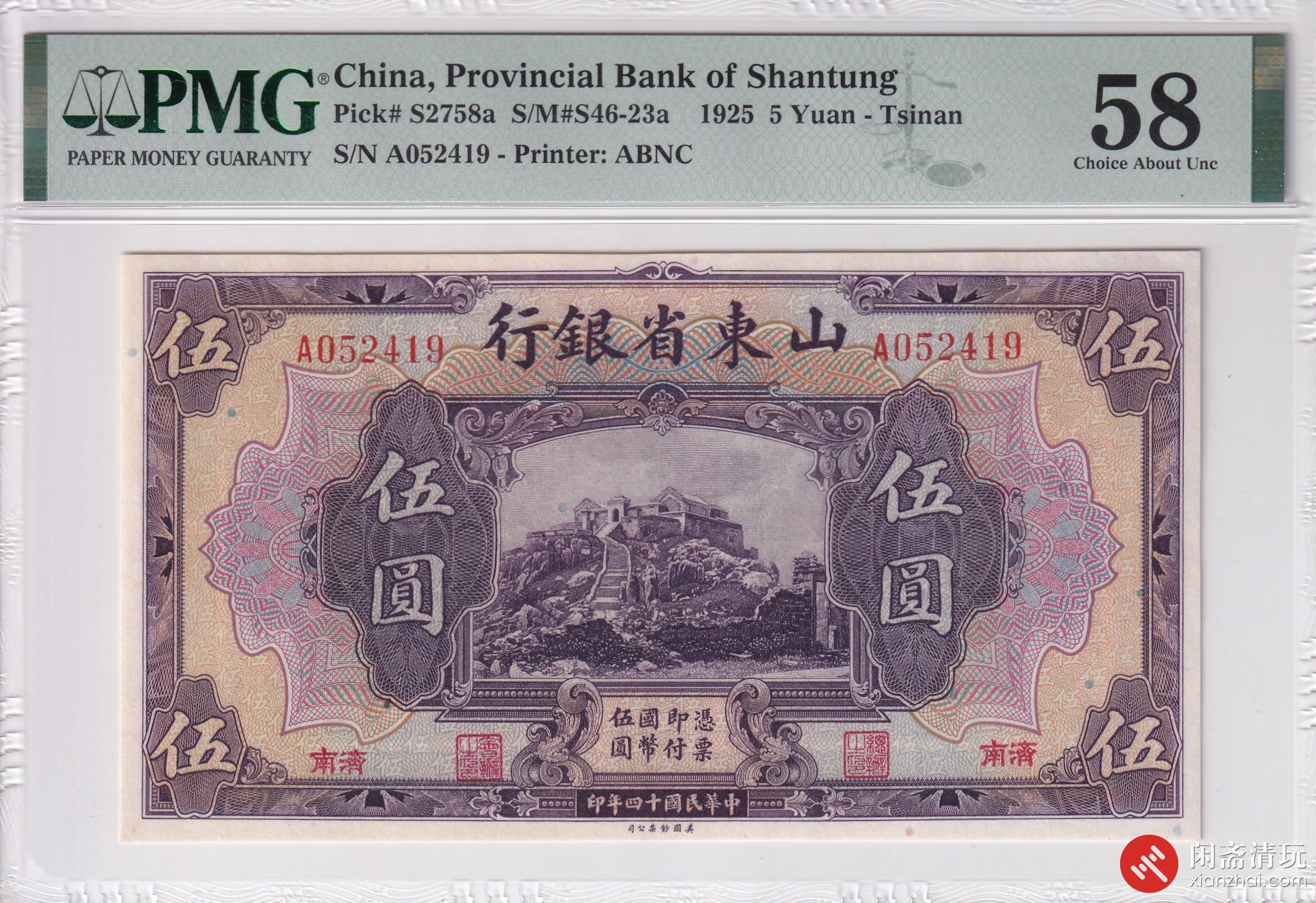 民国十四年(1925)山东省银行伍圆